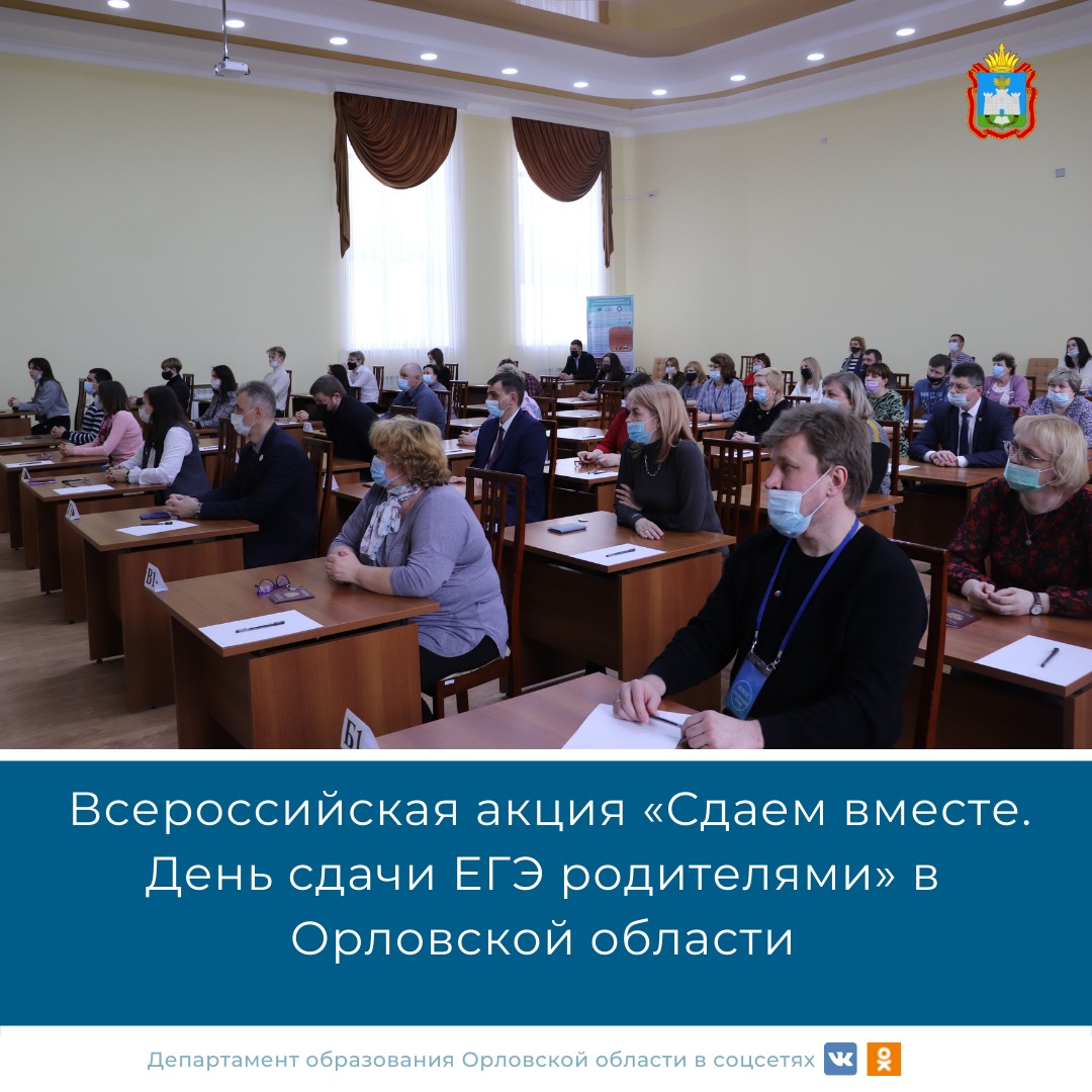 В Орловской области за шесть лет во Всероссийской акции «Сдаем вместе. День сдачи ЕГЭ родителями» приняли участие более 4015 родителей и выпускников общеобразовательных организаций, представителей государственных и муниципальных органов исполнительной власти, Орловского областного Совета народных депутатов, районных и городских Советов народных депутатов, силовых структур и ведомств Орловской области, Аппарата Уполномоченного по правам ребенка в Орловской области, регионального исполкома Общероссийского Народного Фронта, регионального отделения Всероссийского общественного движения «Отцы России», высших учебных заведений.